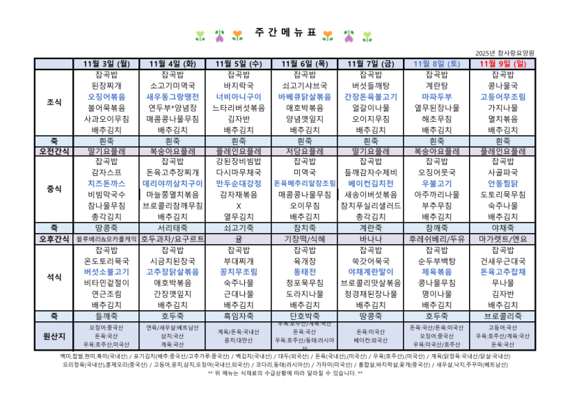11월1째주 식단표