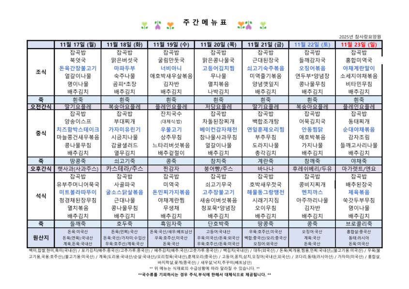 11월3째주 식단표