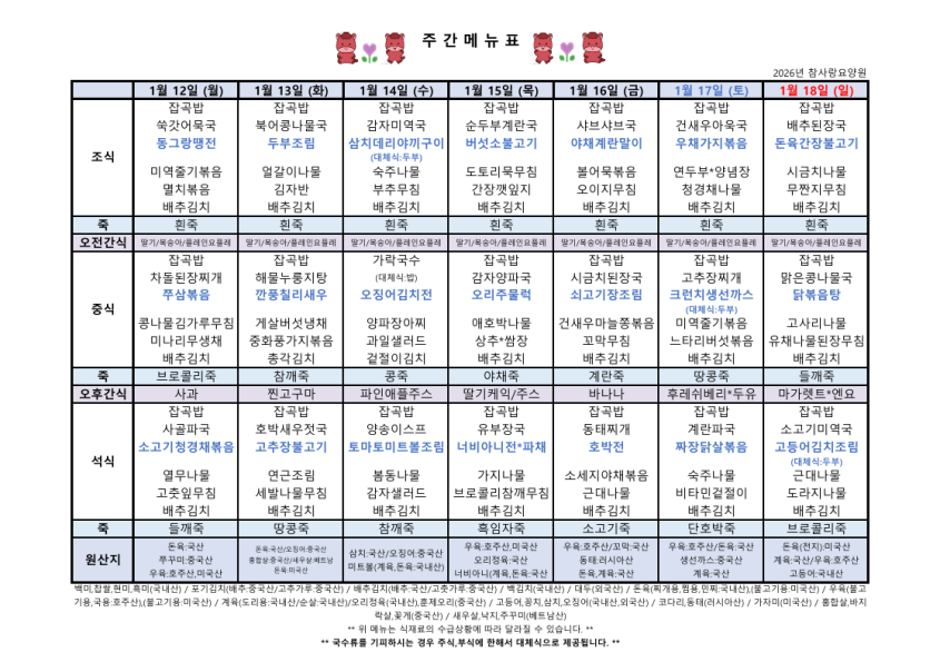 1월2주차 식단표 > 건강 식단표